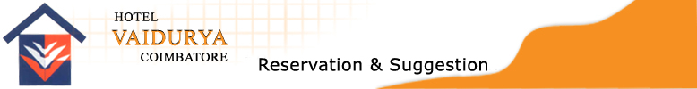 ![]() Hotel Vaidurya 73, Geetha Hall Road, (Opp. to Railway Station), P.B.No.4006 Coimbatore - 641 018, Tamil Nadu, India Phone: + 91 - 422 - 4297777 Fax: + 91 - 422 - 4297788 Mobile: 98433 77000 Email:service@hotelvaidurya.com Website:http://www.hotelvaidurya.com |